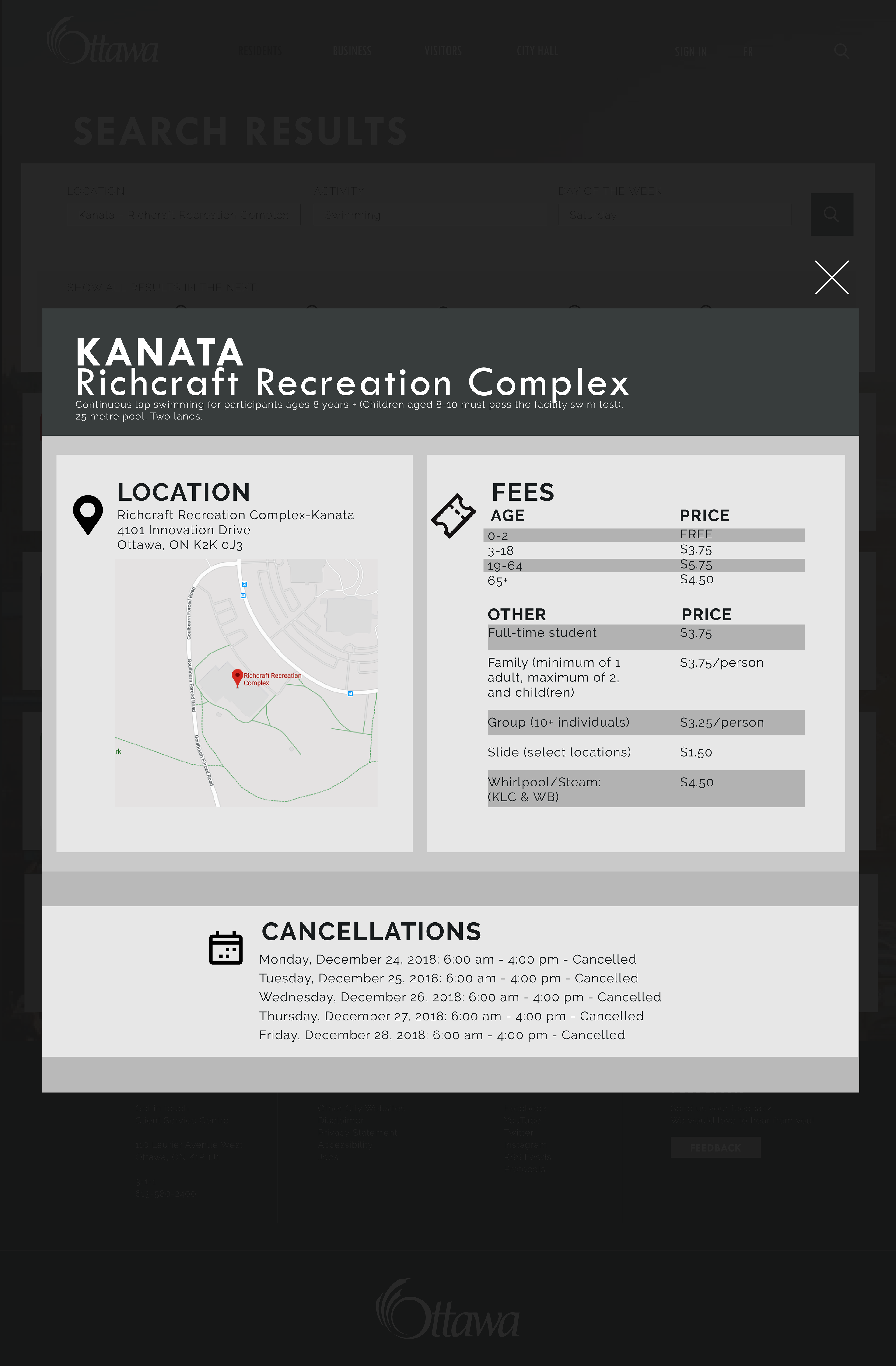 The purpose of redesigning the “Swimming Schedules” page on the City of Ottawa website is to make it easy to navigate and pleasing to the eye. The goal is to allow users to visit the website and find what they need as quickly as possible. The content will be organized in such a way so that any type of user, whether they be local citizens, new citizens, people who are visiting, etc, can easily use the site with no issues.